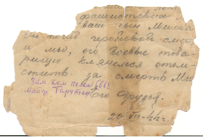 Он погиб геройской смертью и мы, его боевые товарищи клянемся отомстить за смерть Миши.