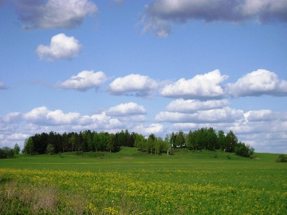 Да только вот кости наших дедушек и бабушек так и остались лежать запаханными под землей и под новой уже, асфальтовой дорогой. С металлоискателем, по высоте и её по северному скату, даже сейчас, ходить невозможно. (звенит, зараза постоянно, матерится.) В 2013 году я нашел-таки одного живого свидетеля живущего ныне в деревне Погорелка. Этот старик рассказал мне, как в 1944-м, после боев, когда 376-я стрелковая дивизия пошла наступать дальше, на Псков, он и ещё несколько пацанов из деревни помогали трофейщикам хоронить наших солдат. Он помнит, что на самой высоте и на её скатах свободного места не было, всё было завалено убитыми. Лежали вперемешку наши и немцы, особенно на высоте, в траншеях. Ведь эта высотка, за пять с небольшим месяцев боёв много раз переходила из рук-в-руки. Исходный рубеж атаки. Снимок сделан с бруствера нашей траншеи. До подножия высоты 450 метров. Я когда представил себя бегущим туда, на кинжальный огонь пулеметов, мне стало жутко…